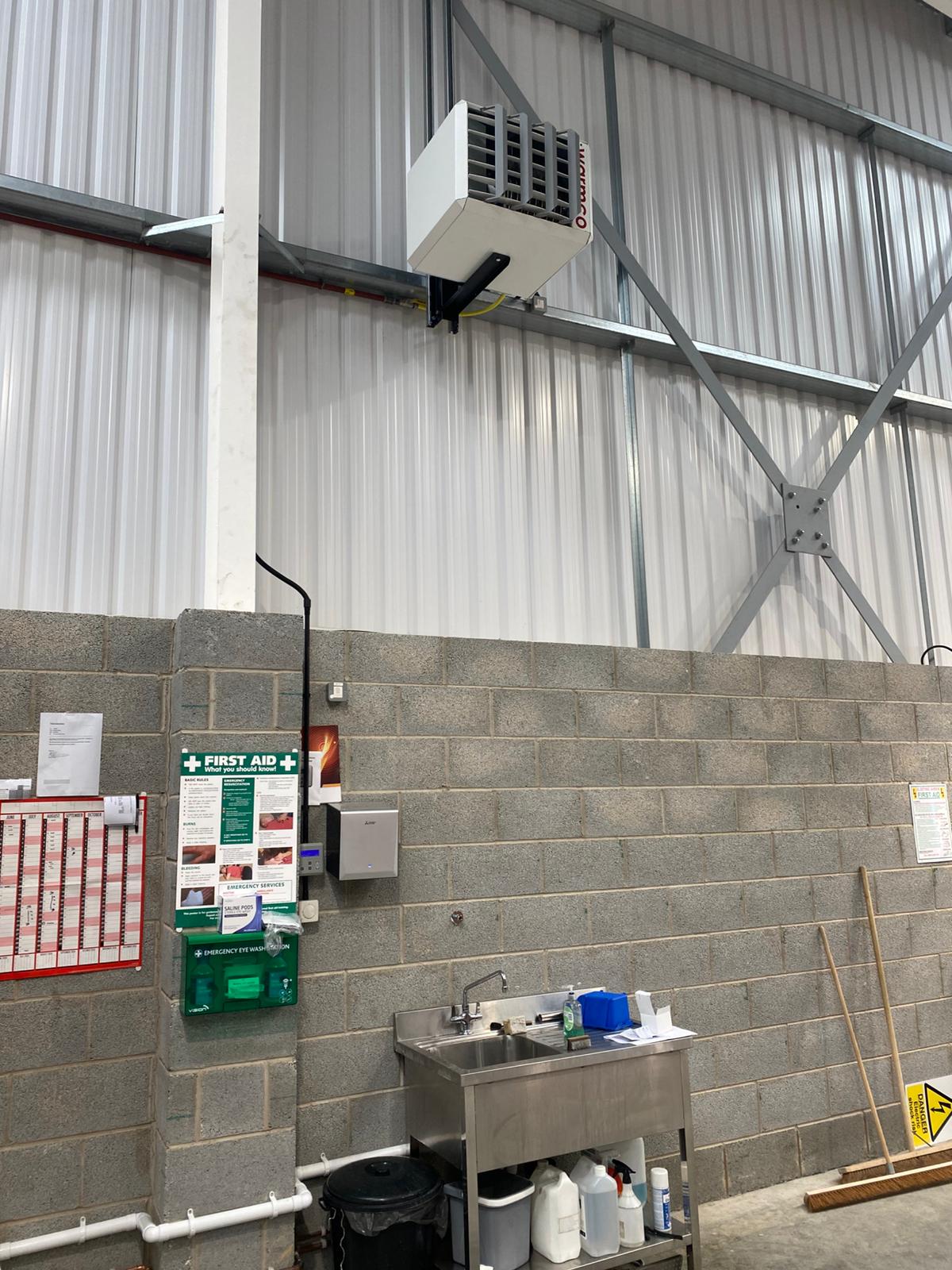 This customer invited us to install a Winterwarm / Warmco, XR20 suspended, gas fired warm air heater into their new premises. The XR20 heater has a maximum heat output of 20.7kw, which can be used to get the area up to temperature. However, once this has been achieved, it can modulate its heat output down to 12.8kw. This modulation feature offers a typical fuel cost saving of up to 30% compared to standard non-modulating heaters. This heater was chosen to heat this 3,000 sq ft space to 20c, when the outside temperature was as low as minus 3c. We also installed a WCU40 de-stratification fans. These can push down 3,200 metres cubed of warm air per hour, which would otherwise gather in the top of the building. The addition of fans can offer an additional fuel cost saving of up to 30%. This workshop heating project was completed in just one day. During this time our engineers worked hard to minimise disruption to the work of our valued customer.
